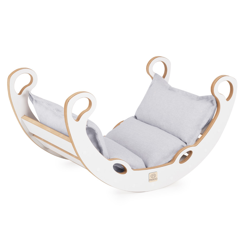 Een unieke klimboog en schommelstoel met kussen in één! De Misioo Mini Rocker Klimboog is een innovatief speelmeubel dat in één beweging transformeert van een schommelstoel naar een klimboog. Draai de schommelstoel eenvoudig om en hij verandert in een stabiele klimboog – perfect voor kleine ontdekkingsreizigers.