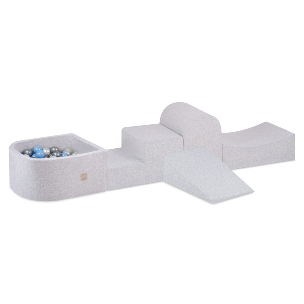 1, 2, 3.. GOOO! Met de geweldige Misioo Hindernisbaan met Ballenbak | Licht Grijs heb je gegarandeerd eindeloos veel speelplezier. Klimmen, klauteren, balanceren en daarna een duik in het ballenbad! De hindernisbaan bestaat uit 5 losse elementen, zodat je 'm kunt indelen zoals jij dat wilt. De elementen zijn gemaakt van zacht foam met een wasbare hoes.