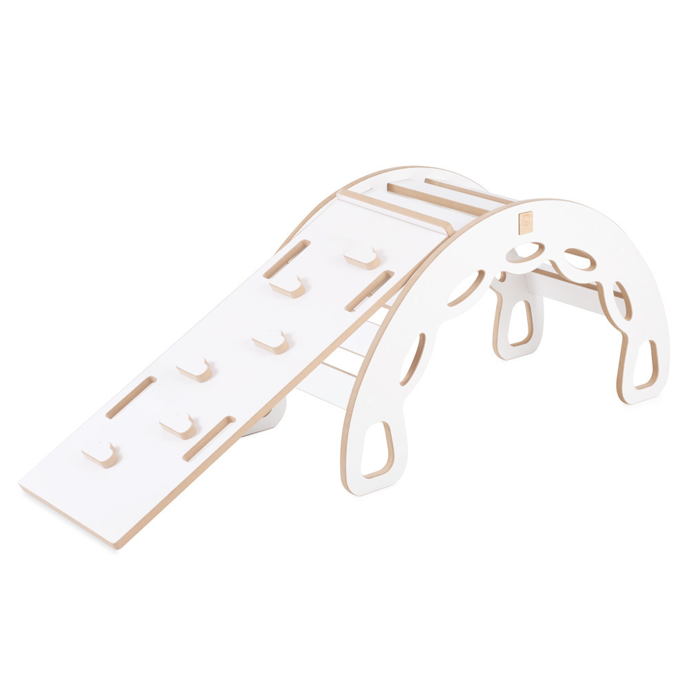 Een veelzijdige houten schommelstoel met een klimboog, klimhelling en glijbaan! De Misioo Rocker 4-in-1 is een speelmeubel dat transformeert van een schommelstoel naar een klimtoestel. Draai de schommelstoel eenvoudig om en hij verandert in een klimboog – perfect voor kleine ontdekkingsreizigers. Wil je nog leuker spelen? Dan kun je de klimhelling toevoegen aan de klimboog. Dit dubbelzijdige element is een echte hit in elke kinderkamer! Aan de ene kant kunnen kinderen hun klimvaardigheden ontwikkelen en aan de andere kant kunnen ze van de glijbaan glijden. Een geweldige manier om plezier te combineren met fysieke activiteit.