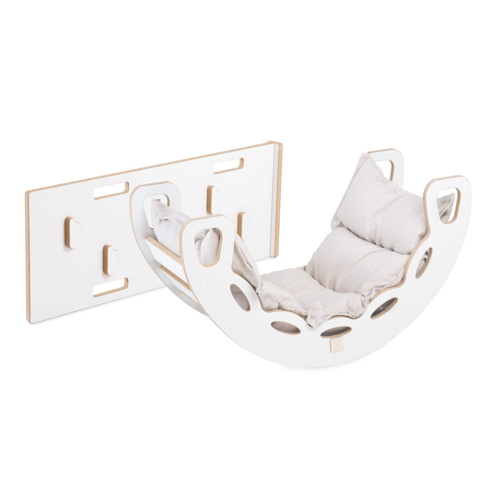 De Misioo rocker 4-in-1 met klimboog, klimhelling en glijbaan is gemaakt van hoogwaardig MDF – een materiaal dat duurzaam, glad en veilig is voor kinderen. Alle randen zijn zorgvuldig afgerond en geschuurd, en het comfortabele, zachte kussen maakt elke schommelervaring puur genot.